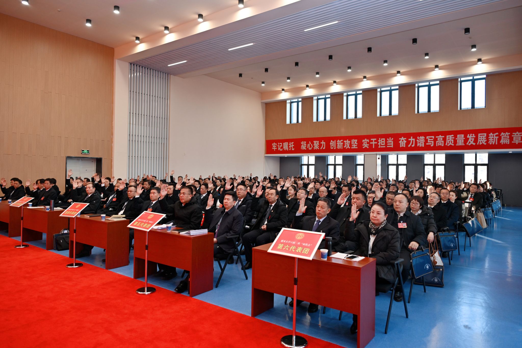 大会期间,共召开2次主席团会议、2次全体会议,组织2次分组讨论。与会代表以高度的责任感和主人翁精神,紧紧围绕学校中心工作与发展大局,深入研讨、集思广益,提出了许多富有建设性的意见和建议,充分体现了新时代延大人的深厚情怀和责任担当。大会顺利完成了全部议程,统一了思想认识,凝聚了发展智慧,明确了前进方向,为学校在新征程上奋力谱写高质量发展新篇章汇聚了磅礴力量。