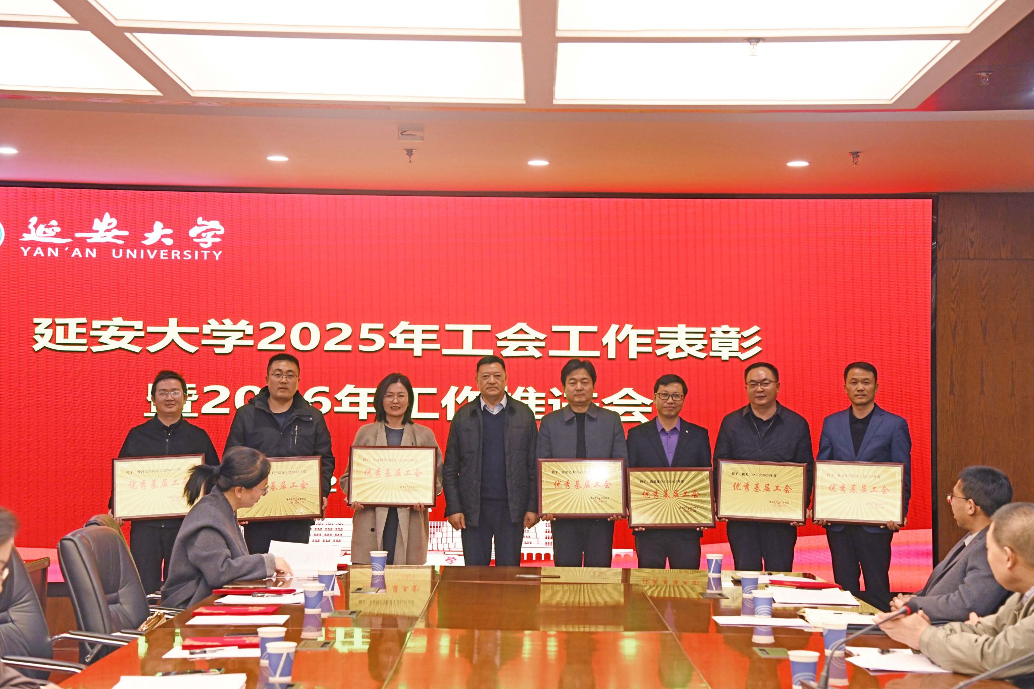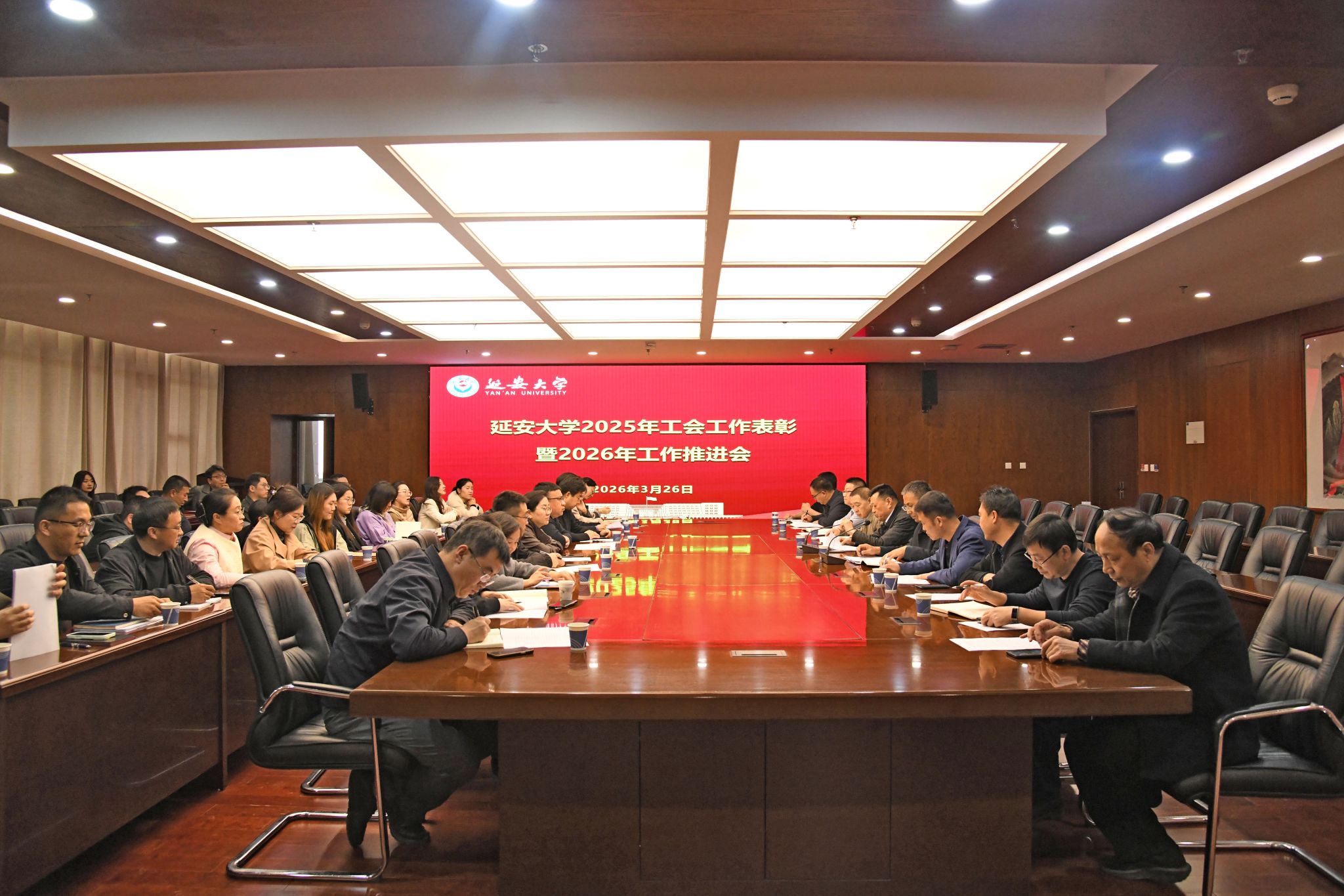 本网讯 3月26日,延安大学2025年工会工作表彰暨2026年工作推进会在行政楼2楼会议室举行。校工会主席杨曦东、各二级分会主席、工会干部以及受表彰的集体和个人参加会议。会议由校工会副主席张永东主持。